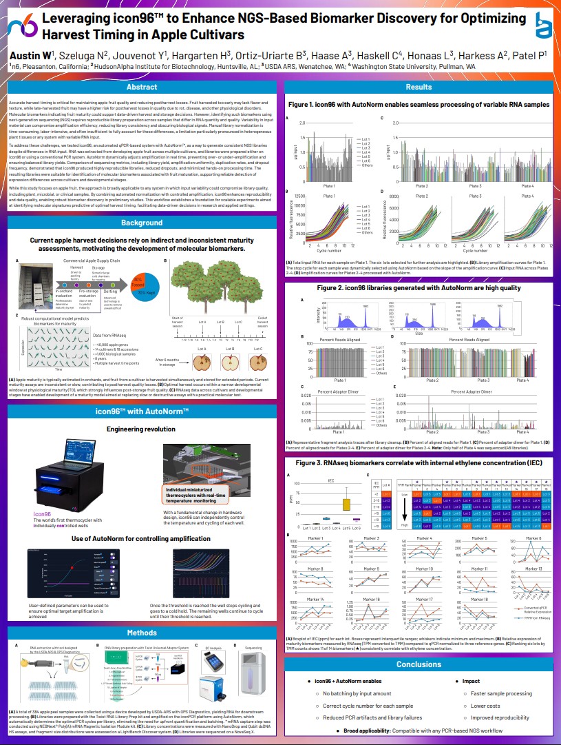 Accurate harvest timing is critical for maintaining apple fruit quality and reducing postharvest losses. Fruit harvested too early may lack flavor and texture, while late-harvested fruit may have a higher risk for postharvest losses in quality due to rot, disease, and other physiological disorders. Molecular biomarkers indicating fruit maturity could support data-driven harvest and storage decisions. However, identifying such biomarkers using next-generation sequencing (NGS) requires reproducible library preparation across samples that differ in RNA quantity and quality. Variability in input material can compromise amplification efficiency, reducing library consistency and obscuring biological signals. Manual library normalization is time-consuming, labor-intensive, and often insufficient to fully account for these differences, a limitation particularly pronounced in heterogeneous plant tissues or any system with variable RNA input. To address these challenges, we tested icon96, an automated qPCR-based system with AutoNorm™, as a way to generate consistent NGS libraries despite differences in RNA input. RNA was extracted from developing apple fruit across multiple cultivars, and libraries were prepared either on icon96 or using a conventional PCR system. AutoNorm dynamically adjusts amplification in real time, preventing over- or under-amplification and ensuring balanced library yields. Comparison of sequencing metrics, including library yield, amplification uniformity, duplication rates, and dropout frequency, demonstrated that icon96 produced highly reproducible libraries, reduced dropouts, and minimized hands-on processing time. The resulting libraries were suitable for identification of molecular biomarkers associated with fruit maturation, supporting reliable detection of expression differences across cultivars and developmental stages. While this study focuses on apple fruit, the approach is broadly applicable to any system in which input variability could compromise library quality, including plant, microbial, or clinical samples. By combining automated normalization with controlled amplification, icon96 enhances reproducibility and data quality, enabling robust biomarker discovery in preliminary studies. This workflow establishes a foundation for scalable experiments aimed at identifying molecular signatures predictive of optimal harvest timing, facilitating data-driven decisions in research and applied settings.